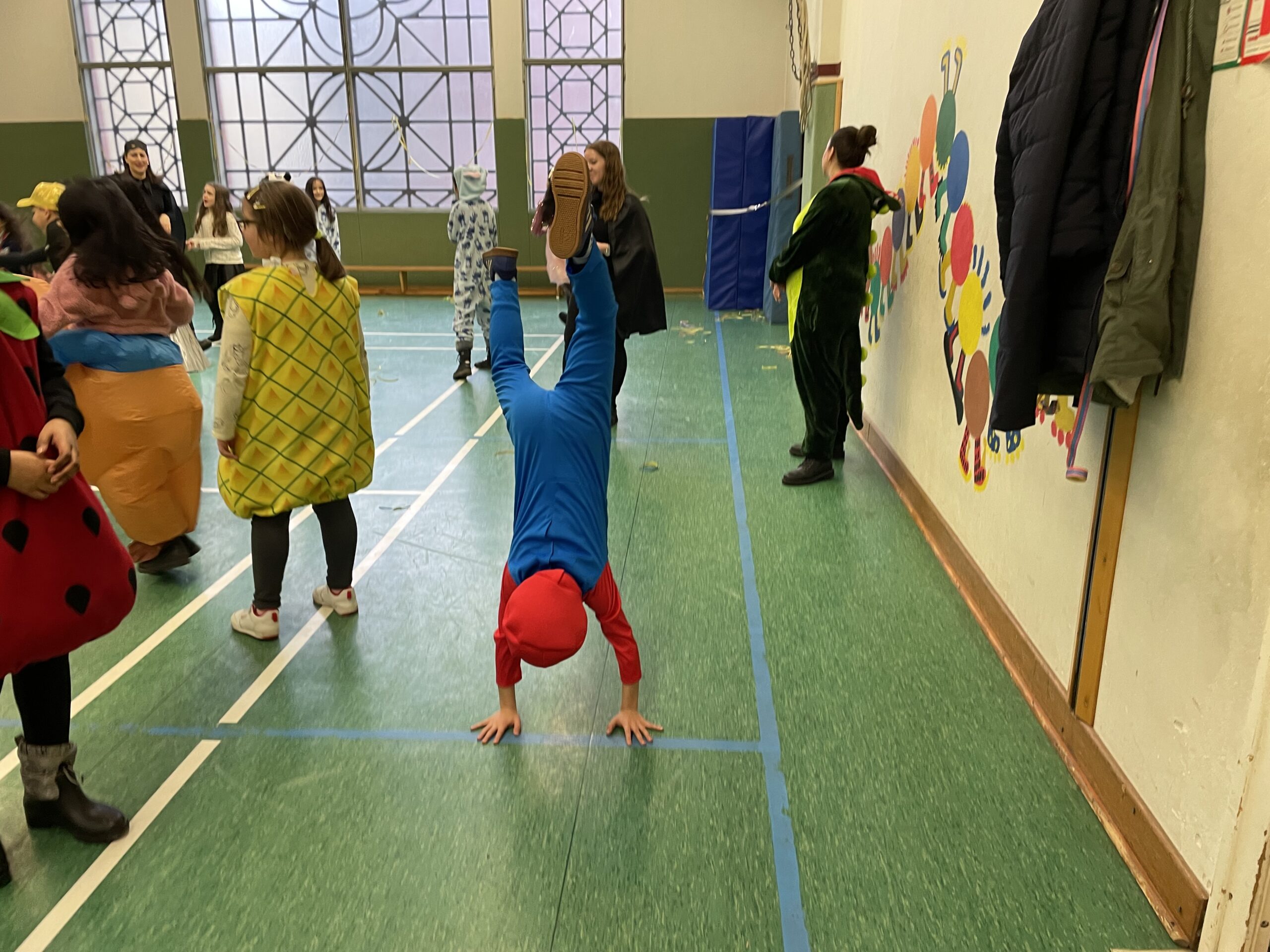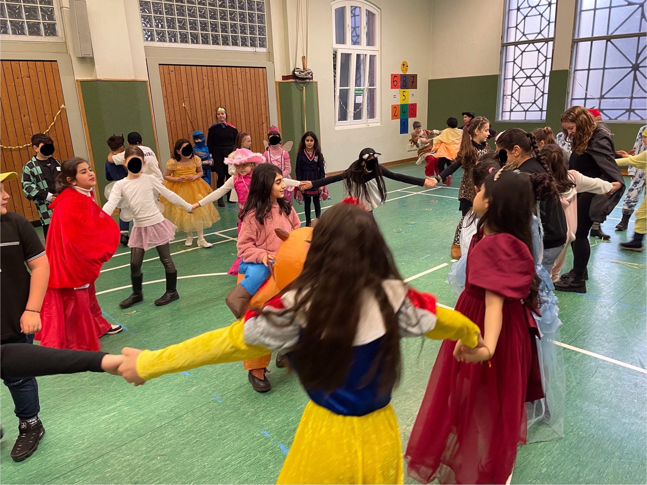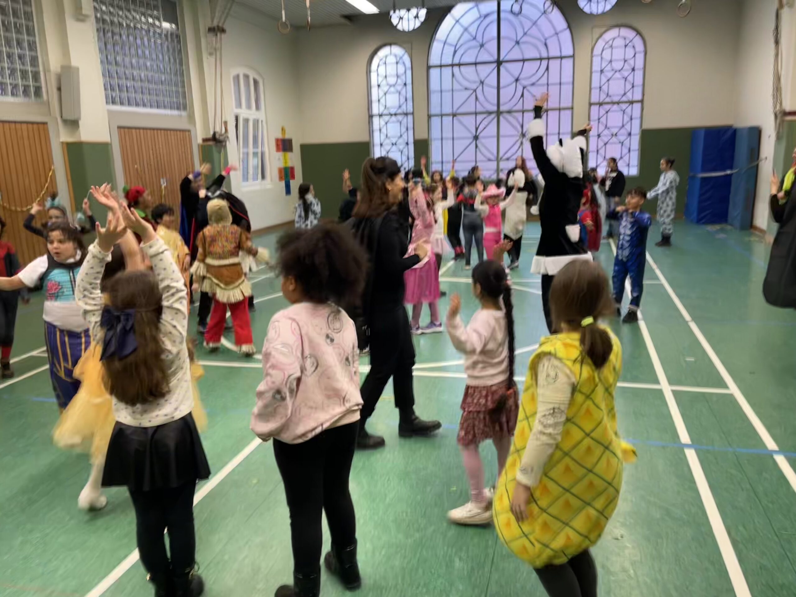 Nacheinander ging jeder Jahrgang in die Turnhalle, wo gemeinsam Spiele gespielt und die tollen Verkleidungen noch einmal vorgeführt wurden. Zum Abschluss zog eine große Polonaise mit allen Schülerinnen und Schülern über den Schulhof.